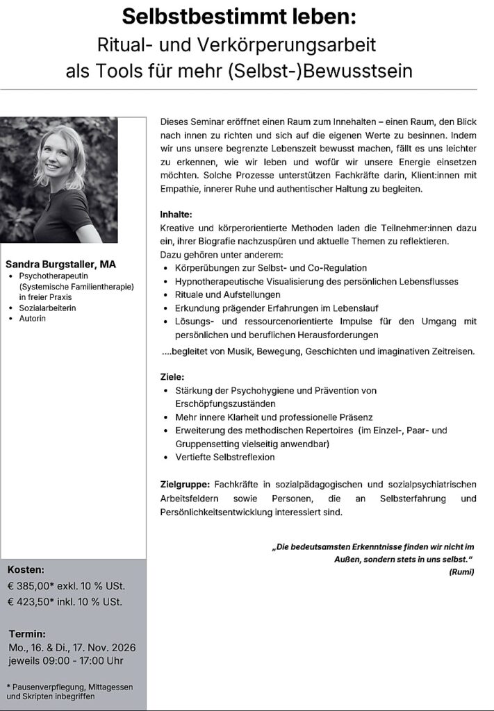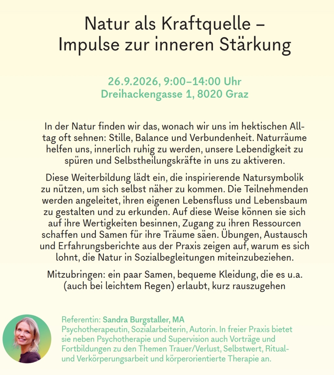 Veranstaltungen Termine für Workshops, Seminare und Vorträge 2026 SelbsterfahrungsseminarSelbstbestimmt leben - Ritual- und Verkörperungsarbeit als Tools für mehr (Selbst-) Bewusstsein 16.-17.11.2026 vamos AkademieMarkt Allhau WeiterbildungsseminarNatur als Kraftquelle - Impulse zur inneren Stärkung 26.09.2026 pro humanisGraz FortbildungsseminarVergänglichkeit als Ressource - Systemische Psychotherapie am Lebensende 21.-22.09.2026IEF - Institut für systemische Entwicklung und Fortbildung Zürich (CHE) Beschreibung WebinarZwischen Ohnmacht und Stärke - Wandlungsprozesse am Lebensende begleiten 27.03.2026Auditorium NetzwerkMüllheim (D) Beschreibung 2025 SelbsterfahrungsseminarSelbstbestimmt leben - Ritual und Verkörperungsarbeit als Tools für mehr (Selbst-)Bewusstsein 06.-07.11.2025vamos AkademieMarkt Allhau ImpulsabendDer letzte aller Übergänge - Psychotherapie an der Schwelle zum Tod 21.05.2025IEF - Institut für systemische Entwicklung und Fortbildung Zürich (CHE) Foto: Nadine Kägi, Zürich FortbildungsseminarTrauerbegleitung nach Verlusterfahrungen 13.05.2025GFSG, Gesellschaft zur Förderung seelischer Gesundheit GmbHHartberg VortragPsychische Herausforderungen für Betroffene und Behandlungsteams bei Therapiezieländerungen 10.04.2025AhoP, Arbeitsgemeinschaft für hämatologische und onkologische PflegepersonenMedizinischen Campus Graz Online-VortragBis zuletzt selbstbestimmt leben - Wandlungsprozesse am Lebensende begleiten 22.01.2025ÖAS - Arbeitsgemeinschaft für systemische Therapie und systemische StudienJour fixe 2024 WorkshopNatur als Ressource - mit Achtsamkeit meinen Lebensfluss erkunden 12.10.2024Jahresfachtagungpro humanisGraz VortragZwischen Ohnmacht und Stärke - Psychotherapie im palliativen Setting 09.04.2024Sozialpsychiatrischer Jour fixeGFSG - Gesellschaft zur Förderung seelischer Gesundheit GmbHHartberg Einladung zum sozialpsychiatrischen Jour Fixe FortbildungsseminarSystemische palliative Psychotherapie 22.-23.03.2024Psychoonkologischer DienstUniversitätsklinikum Tübingen Ich freue mich auf Ihre Anfrage! Habe ich Ihr Interesse geweckt, wenden Sie sich gern per E-Mail oder telefonisch an mich!